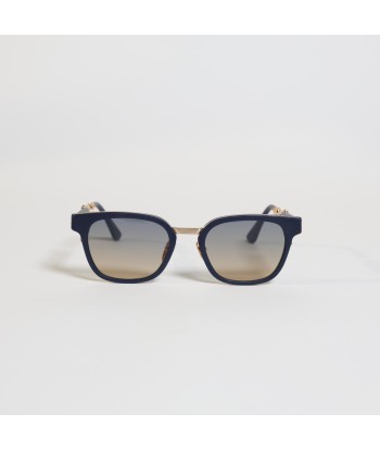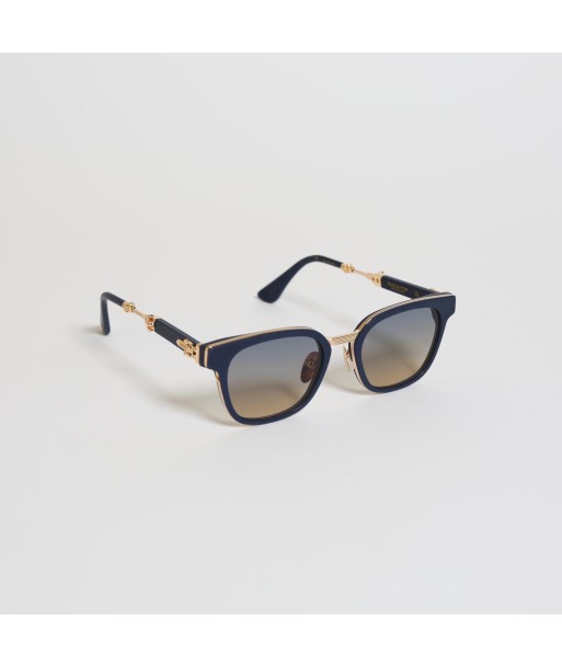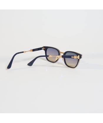 Deep-navy browline paired with a slim gold rim—crisp, modern, and flattering